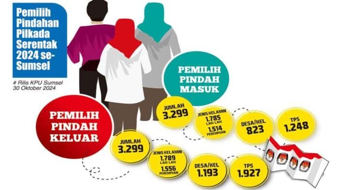 Andika menambahkan, rekapitulasi daftar pemilih pindahan hingga H-30 pilkada, sudah mereka rilis di akun Instagram resmi KPU Provinsi Sumsel. Terlihat dari 6.644 pemilih pindahan itu, terdiri dari 3.299 pemilih pindah masuk dan 3.345 pemilih pindah keluar.