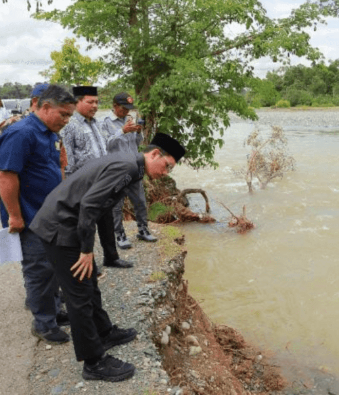 ” Kondisi sungai semakin melebar dan abrasi yang tinggi bisa terus menggerus badan jalan, ini harus di tangani dengan serius” kata bupati Tarmizi.