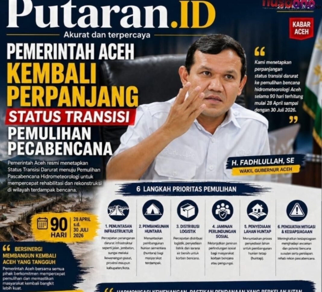 Pemerintah Provinsi Aceh resmi memperpanjang Status Transisi Darurat Pemulihan Pascabencana hidrometeorologi selama 90 hari, terhitung mulai 28 April hingga 30 Juli 2026. Langkah ini diambil guna memastikan proses rehabilitasi dan rekonstruksi berjalan tuntas di seluruh wilayah terdampak.