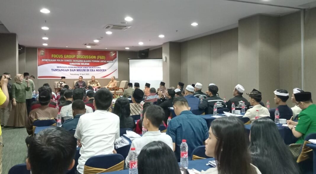 Redaksi.co | Palembang – Polda Sumatera Selatan (Sumsel ) dalam hal ini Dit Intelkam Polda Sumsel bersama Aliansi Pemuda Lintas Agama Sumatera Selatan (Sumsel) melaksanakan kegitan Fokus Grup Discussion (FGD) dengan tema menjaga kerukunan umat beragama tantangan dan solusi di era modern, yang di laksanakan di Meeting Room Hotel Batiqa Palembang, Sabtu (19/04/24)
