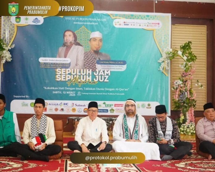 Redaksi.co, Prabumulih – Asisten III Bidang Administrasi Umum Kota Prabumulih, Drs. Amilton, menghadiri acara “1 Hari Spesial Bersama Al-Qur’an (10 Jam 10 Juz)” yang digelar di Gedung Kesenian Rumah Dinas Wali Kota Prabumulih, Jumat (15/3). Acara ini mengangkat tema “Kokohkan Hati dengan Iman, Taklukkan Dunia dengan Al-Qur’an” dan bertujuan memperkuat kecintaan masyarakat terhadap Al-Qur’an.