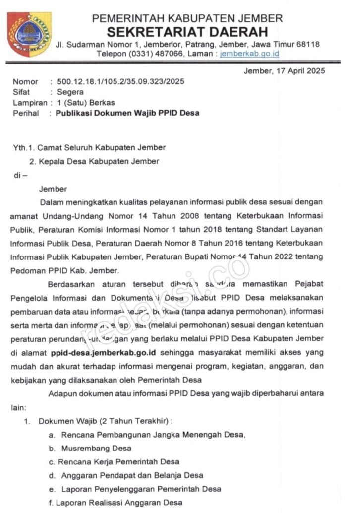 Jember, redaksi.co – Upaya mendorong transparansi di tingkat desa membuahkan hasil. Pemerintah secara resmi menerbitkan Surat Edaran (SE) terkait Keterbukaan Informasi Publik (KIP) untuk desa. Terbitnya SE ini mendapat sambutan positif dari berbagai kalangan, termasuk masyarakat yang selama ini aktif menyuarakan perbaikan layanan publik.