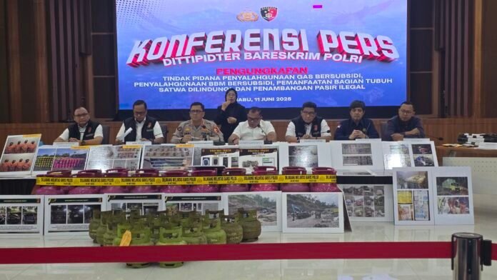 Redaksi.co, Jakarta – Bareskrim menggelar konferensi pers di Jalan Trunojoyo, Jakarta Selatan, untuk menyampaikan hasil pengungkapan tiga kasus penting yang menjadi sorotan publik, yakni penyalahgunaan gas LPG 3 kg bersubsidi, penambangan pasir ilegal, dan perdagangan sisik trenggiling, Rabu (11/6).