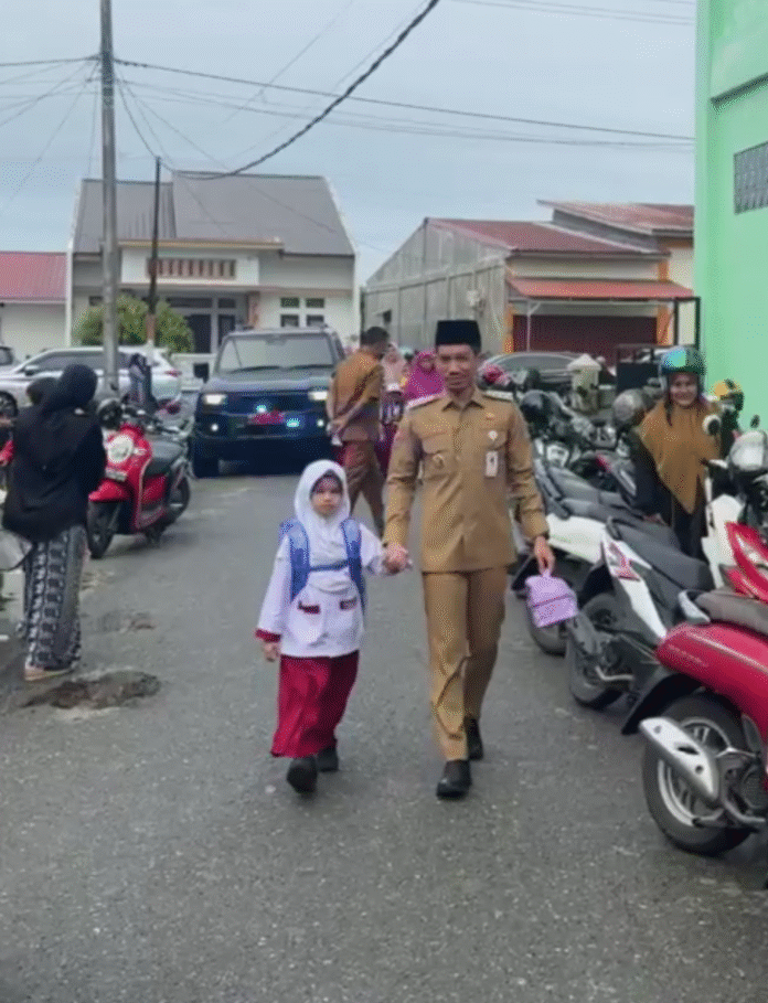 Pada hari pertama masuk sekolah tahun ajaran baru 2025/2026, Senin pagi, Bupati Tarmizi tampak hadir secara langsung mengantarkan putrinya ke SD IT Teuku Umar, Meulaboh. Senin,14/7/25.