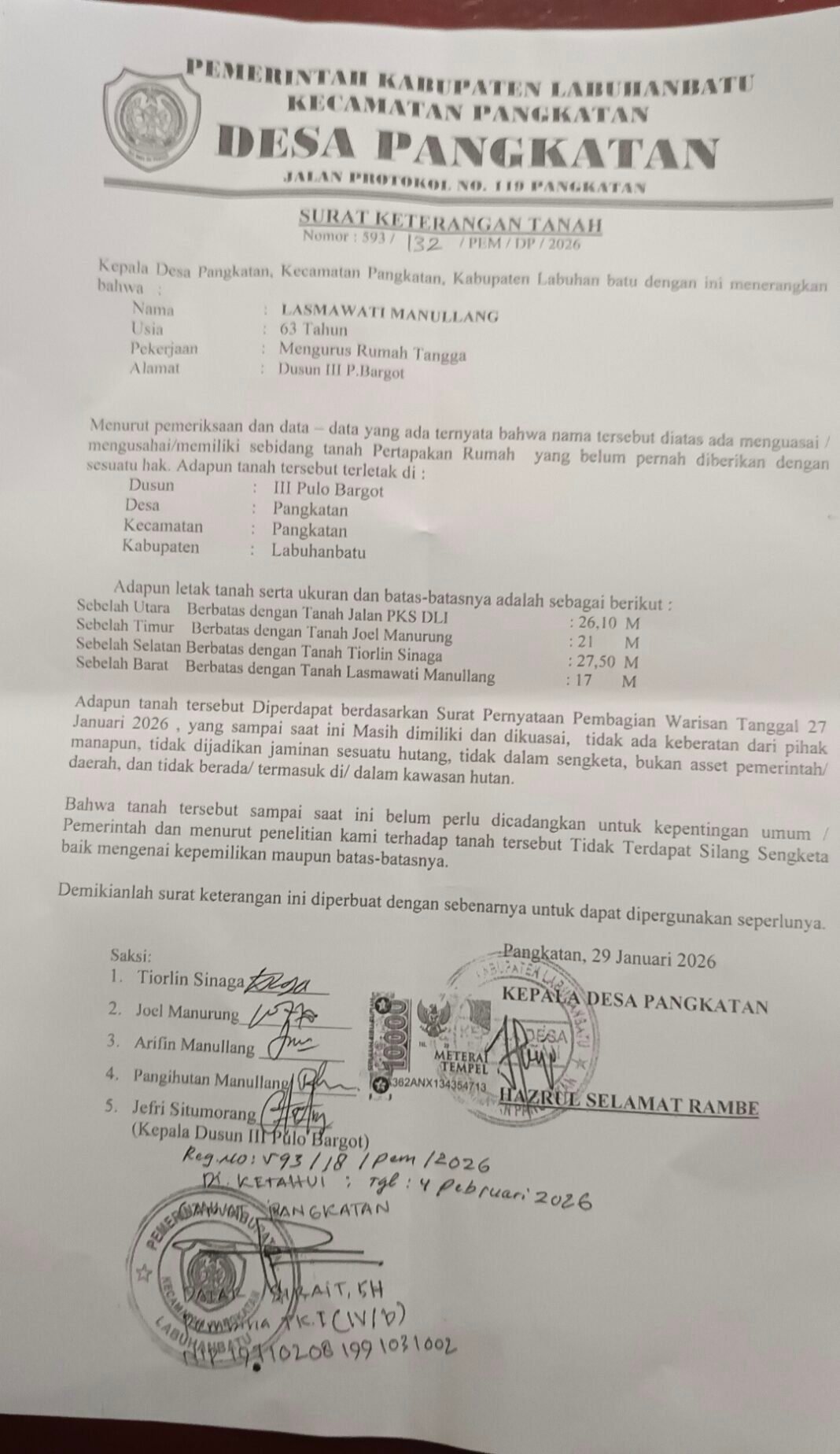 Camat Dan Kepala Desa Pangkatan menanggapi masukan dan kesaksian masyarakat tentang sejarah tanah itu mereka dari pihak pemerintah kecamatan Pangkatan memutuskan agar surat tanah yang sudah diterbitkan atas Nama: LASMAWATI MANULLANG , di Batalkan dan atas kesepakatan dengan pemegang surat yang sudah diterbitkan.Rabu tanggal (04/03/2026)