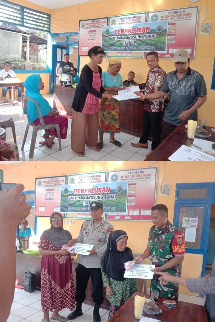 Dalam pembagian BLT-DDini terlihat hadir PJs Kades suka negri,pihak kecamatan Topos,Babinsa, Babinkabtimas,BPD,Serta pemdes suka negri,serta Masyarakat penerima bantuan,