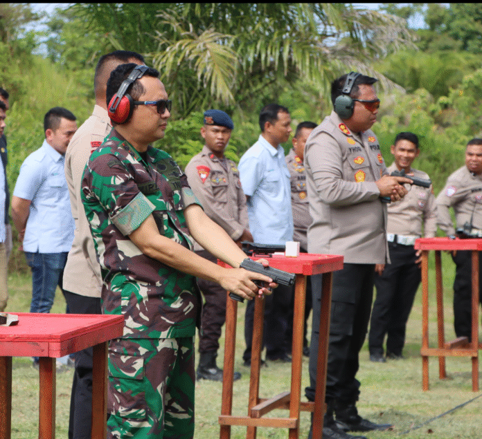 Perkuat sinergitas, TNI – Polri wilayah Aceh Barat dan Nagan Raya melaksanakan silaturahmi sekaligus unjuk kebolehan dalam ajang latihan menembak eksekutif di Mako Batalyon C Pelopor Satbrimob Polda Aceh yang berlokasi di Desa Ujong Fatihah Kecamatan Kuala Kabupaten Nagan Raya, Rabu 25/6/2025