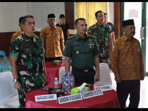 Danrem 012/TU Kolonel Inf Benny Rahadian, S.E., M.Han., dan Dandim 0105/Abar Letkol Inf Hendra Mirza, S.E., M.Sim, menghadiri rangkaian kegiatan Halal Bihalal Purnawirawan TNI – Polri dengan Presiden RI Prabowo Subianto secara virtual yang digelar di Aula Makodim 0105/Abar Jalan Imam Bonjol Desa Drien Rampak Kecamatan Johan Pahlawan, Rabu (7/5/2025)