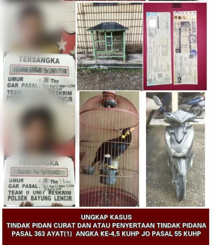 Redaksi.co, Muba – Demi bermain judi slot, dua pria berinisial HG dan AG, warga Kelurahan Bayung Lencir, Kecamatan Bayung Lencir, Kabupaten Musi Banyuasin (Muba), nekat mencuri burung beo milik warga setempat.