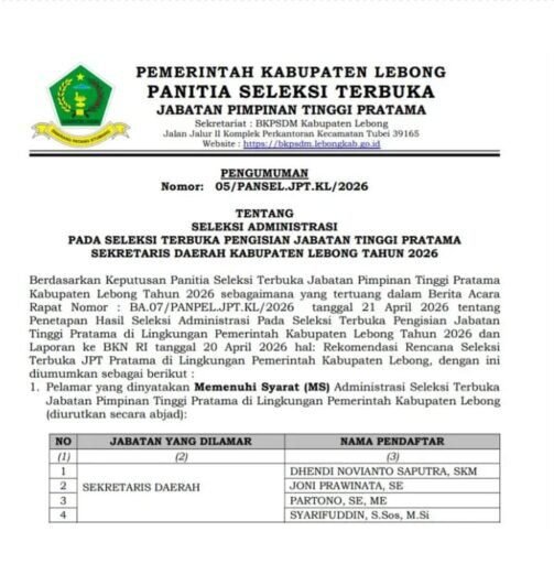 ­Lebong-Redaksi.co-23 April 2026 Panitia Seleksi Jabatan Sekretaris Daerah Telah Mengumumkan hasil seleksi administrasi pada seleksi terbuka untuk jabatan Sekretaris daerah Kabupaten Lebong melalui pengumuman Resmi Nomor : 05/PANSEL JPT.KL/2026 yang ditanda tangani oleh Ketua Pansel Dr. H. Herwan Antoni, SKM, M.Kes, M.si , memutuskan 4 Orang peserta seleksi administrasi yaitu