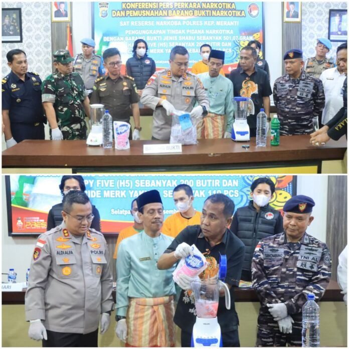 Meranti,- Polres Kepulauan Meranti Gelar Conferensi Pers serta Pemusnahan Barang Bukti atas Pengungkapan Kasus Narkotika jenis Shabu seberat 501,07 Gr, Happy Five sebanyak 200 butir, dan Catride merk Yakuza sebanyak 110 Pcs oleh Sat Res Narkoba Polres Kepulauan Meranti di Ruang Rupatama Jumat (5/12/2025) Pagi.
