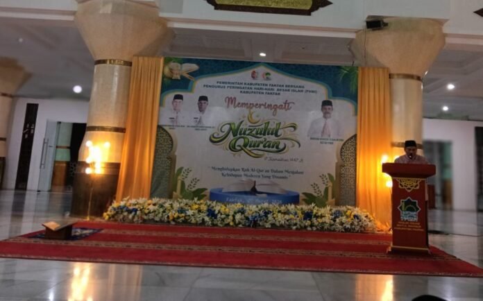 Fakfak, Redaksi.co – Bupati Fakfak menghadiri kegiatan peringatan malam Nuzulul Qur’an yang digelar di Kabupaten Fakfak pada Sabtu (07/03/2026). Dalam kesempatan tersebut, Bupati juga menyampaikan sambutan di hadapan para tamu undangan dan masyarakat yang hadir.