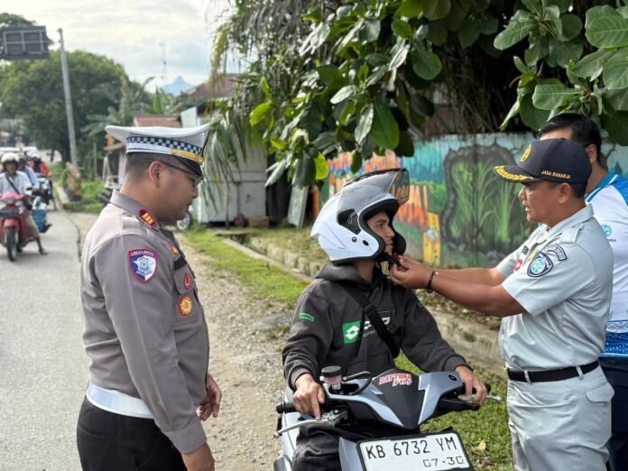 Kegiatan yang berlangsung di wilayah hukum Polres Singkawang ini diisi dengan aksi pembagian helm berstandar SNI kepada pengendara sepeda motor yang kedapatan belum menggunakan perlengkapan keselamatan. Aksi ini menjadi wujud nyata sinergi antara Jasa Raharja dan Polri dalam mengedukasi masyarakat untuk selalu mengutamakan keselamatan sebagai kebutuhan utama, bukan sekadar kewajiban.