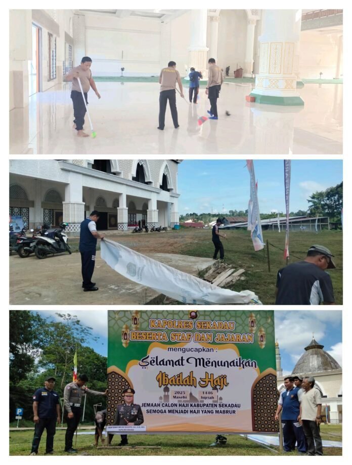 Personel Polres Sekadau membersihkan bagian dalam dan luar masjid, termasuk tempat wudhu, halaman, serta area parkir yang akan digunakan saat pemberangkatan jamaah. Suasana kerja bakti berlangsung tertib dan penuh semangat kebersamaan antara petugas dan masyarakat.