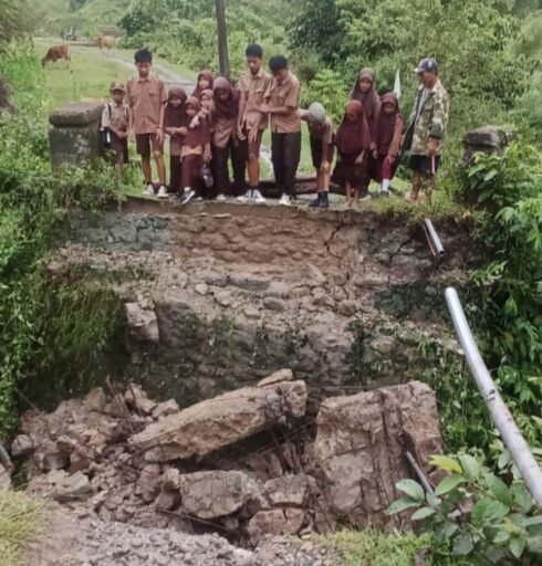 “Jembatan roboh total, jalan putus. Siswa yang hendak berangkat sekolah hari ini terpaksa ditunda karena tidak ada akses menyeberang,” jelasnya.