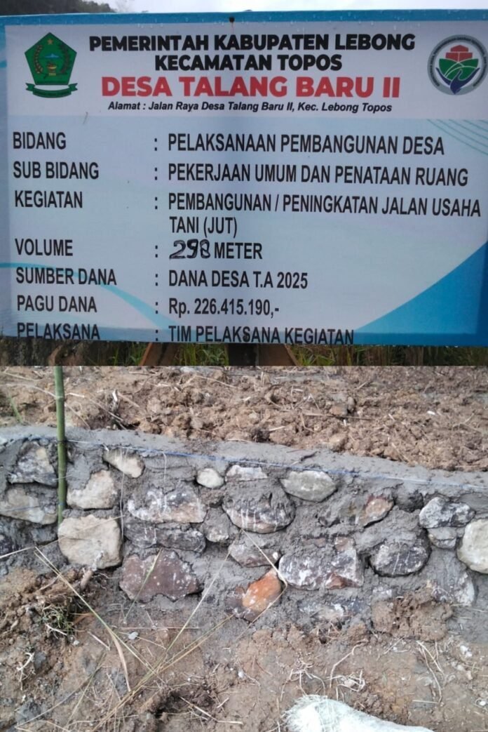 Lebong – Redaksi.co Pembangunan Jalan Usaha Tani (JUT) Tahun Anggaran Desa Talang Baru II Kecamatan Topos Kabupaten Lebong Tahun Anggaran 2025 yang bersumber dari Dana Desa diduga dibangun asal jadi. JUT tersebut dibangun di Dusun II.