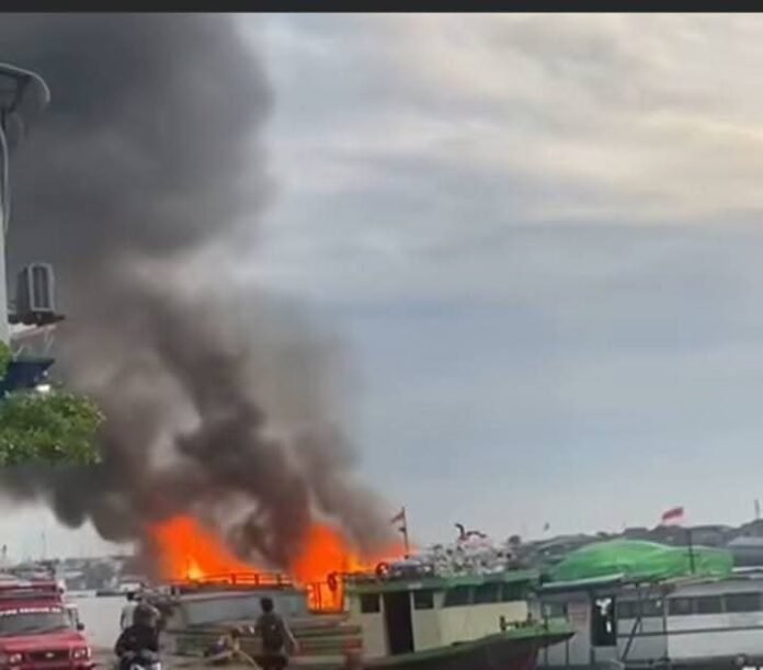 KAPAL TERBAKAR DI PELABUHAN SENGHIE, API MELAHAP TANPA AMPUN