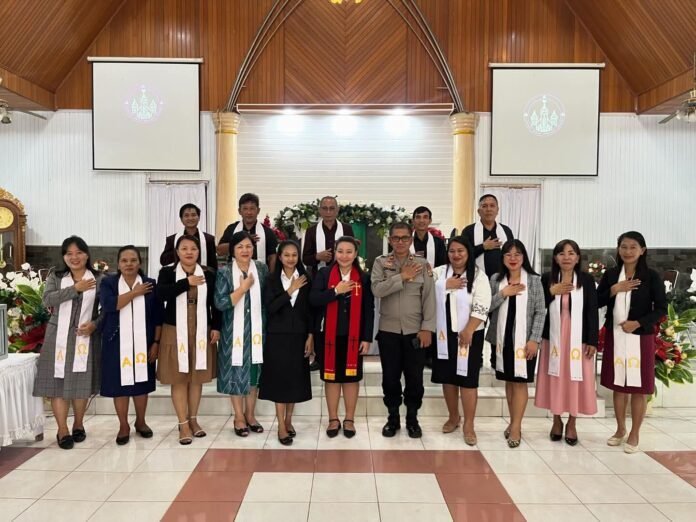 Minahasa Selatan, Redaksi.Co — Dalam rangka menyambut perayaan Pengucapan Syukur yang akan dilaksanakan pada Minggu, 13 Juli 2025, Kapolsek Tumpaan IPTU Oksin DJ. Prong melaksanakan kegiatan Minggu Kasih di Gereja GMIM “Syalom” Desa Lelema, Kecamatan Tumpaan, Kabupaten Minahasa Selatan.