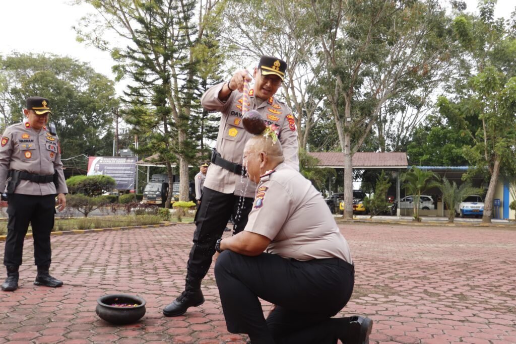 Upacara diawali dengan tradisi penyiraman kembang oleh Kapolres sebagai bentuk penghormatan dan apresiasi atas dedikasi serta pengabdian yang telah diberikan selama bertugas di institusi Polri. Suasana berlangsung khidmat dan penuh rasa syukur.