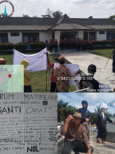 Oki-Redaksi.co Selasa, 20 Mei 2025. Ratusan Masyarakat Airsugihan yang tergabung dalam FORUM MASYARAKAT AIRSUGIHAN BERSATU (FMAB) yang terdiri dari banyak elemen masyarakat baik itu organisasi Masyarakat, organisasi Pemuda,tokoh agama,tokoh masyarakat,tokoh pemuda. Melakukan Aksi Damai menyuarakan aspirasinya dengan satu tuntutan agar Bapak Bupati Muchendi Mahzareki SE MSi mengevaluasi untuk mengganti Camat Airsugihan, Ardiles P Rajo Siahaan.