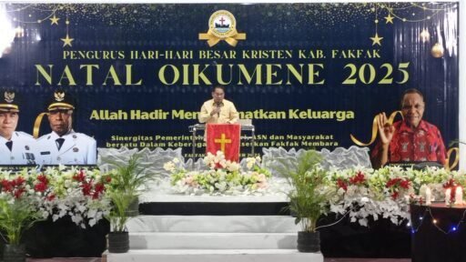 FAKFAK, Redaksi.co — Bupati Fakfak Samaun Dahlan bersama Wakil Bupati Donatus Nimbitkendik menghadiri Ibadah Natal Oikumene 2025 yang digelar Pengurus Hari-Hari Besar Kristen (PHBK) Kabupaten Fakfak, Senin (29/12/2025).