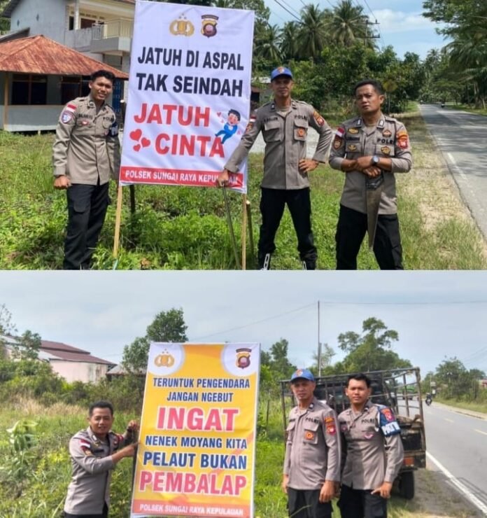 Bengkayang, kalbar – Redaksi.co Polda Kalbar, Polres Bengkayang, Polsek Sungai Raya Kepulauan, telah dilaksanakan Pemasangan bener himbauan kamtibmas dalam berlalu lintas di Kecamatan Sungai Raya Kepulauan Kabupaten Bengkayang. rabu tanggal 26 Maret 2025 sekira pukul 10.00 Wib
