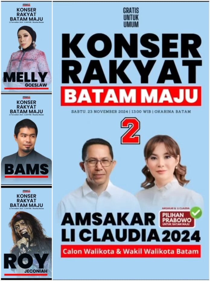 Menurut kabar yang dihimpun awak media kabarnya pesta rakyat untuk warga batam ini akan menghadirkan Artis Senior Ibu kota Yaitu Melly Goeslaw dan Bams ( Samsons ) Dan menghadirkan Rocker Roy Jeconiah yang akan di gelar di Pantai wisata Ocarina pada Sabtu 23 November 2024.