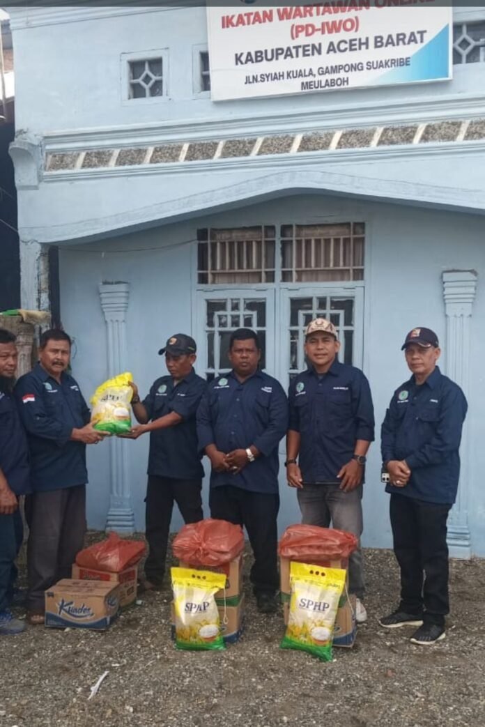 Penyerahan bantuan untuk rekan seprofesi ini berlangsung di kantor sekretariat PD Iwo di kawasan Gampong Suak Ribe Kecamatan Johan Pahlawan pada Jumat 5/12/2025