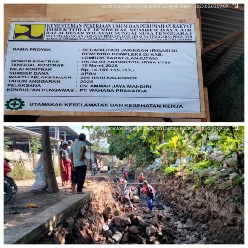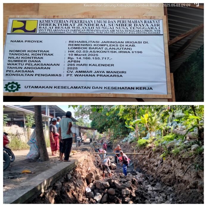 Gerung, Redaksi.co – Pemerintah pusat melalui Kementerian Pekerjaan Umum dan Perumahan Rakyat (PUPR) kembali menunjukkan komitmennya dalam mendukung ketahanan pangan nasional dan pembangunan infrastruktur pertanian. Salah satunya melalui proyek rehabilitasi jaringan irigasi di wilayah Remening Komplek, Kecamatan Gerung, Kabupaten Lombok Barat, Provinsi Nusa Tenggara Barat.