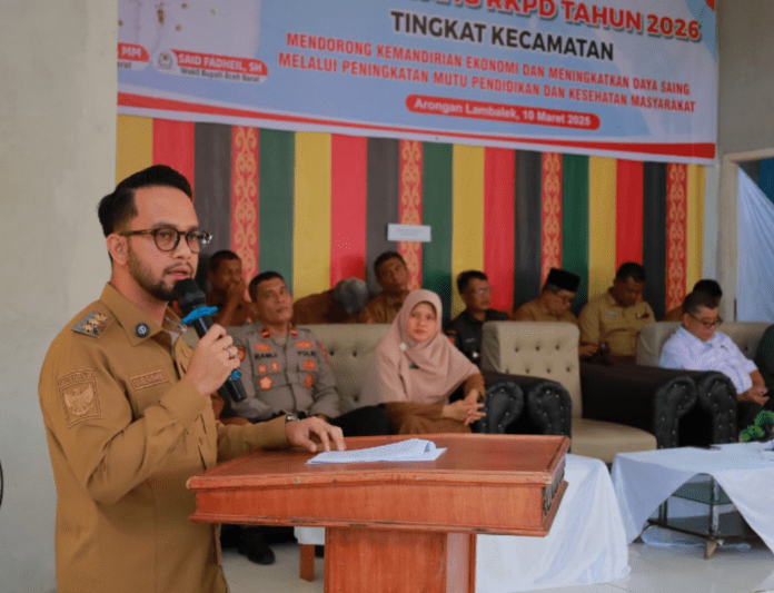 Pemerintah Kabupaten Aceh Barat melalui Badan Perencanaan Pembangunan ( Bappeda) menggelar Musyawarah Perencanaan Pembangunan ( Musrenbang ) perdana tingkat Kecamatan untuk tahun 2026 bertempat di Aula Kantor Camat Arongan Lambalek Senin 10/3/2025.
