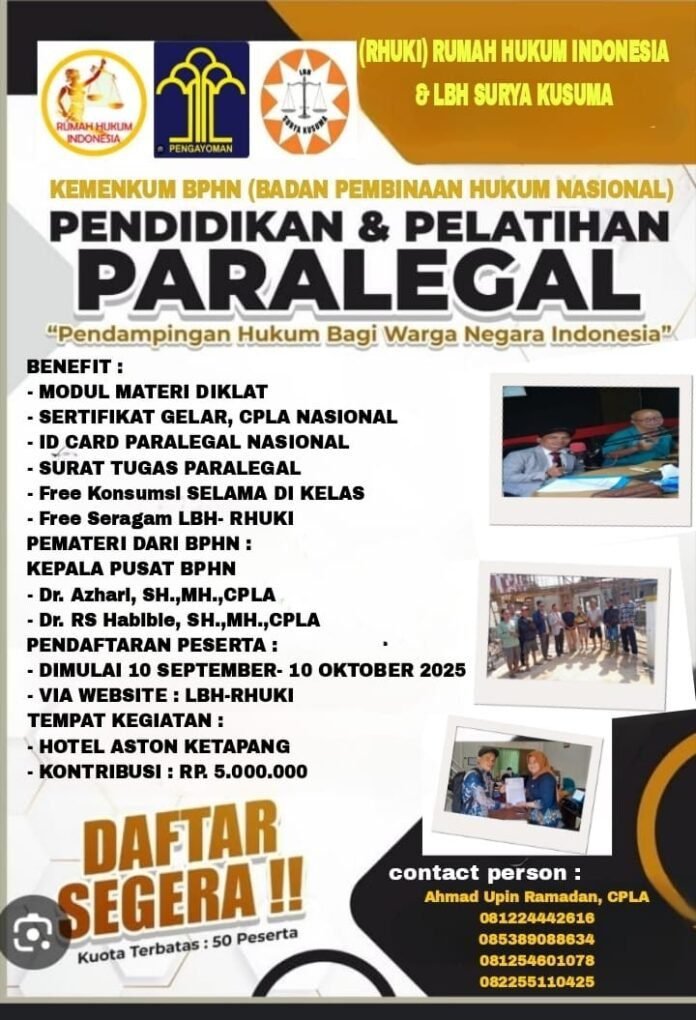 Ketapang, Agustus 2025 ~ Rumah Hukum Indonesia (RHI) bersama LBH Surya Kusuma akan menyelenggarakan Pendidikan dan Pelatihan (Diklat) Paralegal di Kabupaten Ketapang. Kegiatan ini dijadwalkan di bulan Oktober 2025 disalah satu hotel di Kabupaten Ketapang, dengan kuota terbatas sebanyak 50 peserta.