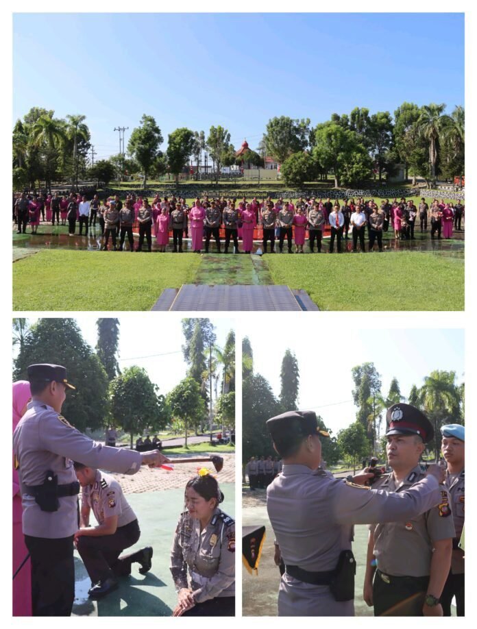 Upacara kenaikan pangkat ini berlangsung khidmat namun penuh kebanggaan, disaksikan oleh para pejabat utama Polres, Bhayangkari, dan keluarga para personel yang naik pangkat. Prosesi semakin semarak saat tradisi penyiraman air bunga dilangsungkan – simbol kesucian dan harapan akan tanggung jawab baru yang diemban para anggota. Para personel yang telah dilantik juga mendapat kejutan penyiraman menggunakan mobil water cannon, menciptakan suasana penuh keceriaan dan semangat kebersamaan.