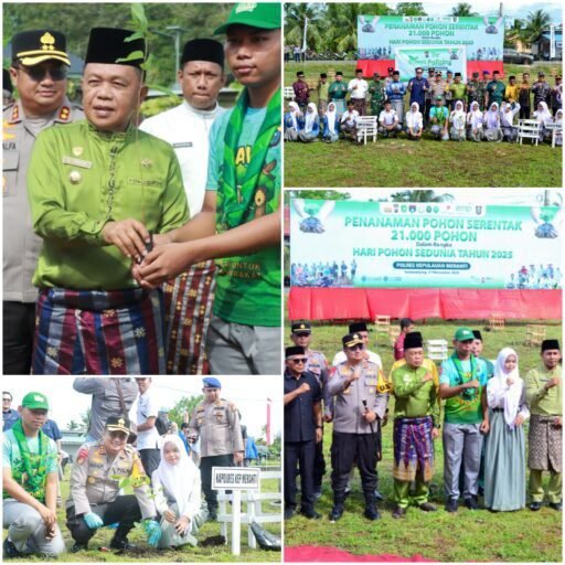 Meranti,- Polres Kepulauan Meranti Gelar Penanaman Pohon Serentak 21.000 Dalam Rangka Hari Pohon Nasional tahun 2025 yang pimpin langsung oleh Bupati Kepulauan Meranti AKBP (Purn) H.Asmar dan Kapolres Kepulauan Meranti AKBP Aldi Alfa Faroqi, S.I.K., M.H.bersama jajaran Forkopimda Kanor Perpustakaan Jalan Perumbi Kota Selatpanjang Jumat (21/11/2025) Pagi.
