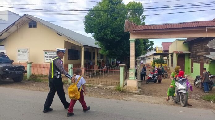 Personil Polsek Sosa yang melaksanakan tugas gatur lalin Aiptu PH. Pasaribu, S.H di Depan SDN 0401 CENTER Desa Pasar Ujung Batu, Kecamatan Sosa, Kabupaten Padang Lawas