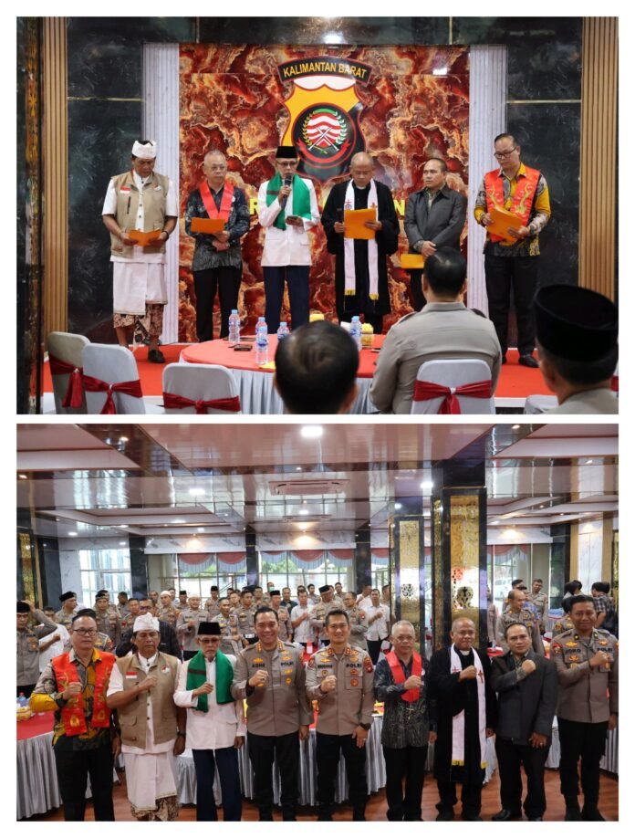 Polresta Pontianak , Polda Kalbar – Dalam rangka pembinaan tradisi menyambut Hari Bhayangkara ke-79, Polresta Pontianak menggelar acara Doa Lintas Agama yang berlangsung khidmat di ruang Ballroom Presisi, Mapolresta Pontianak, Kamis (26/6/2025).