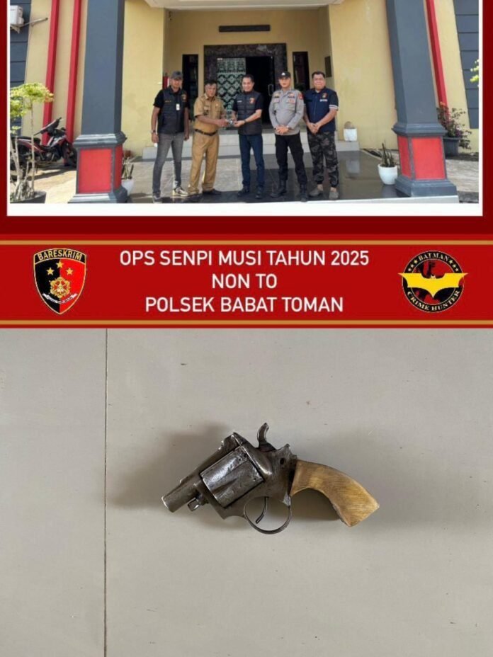 Ditambahkan Kapolsek. Pihaknya Menerima penyerahan 1 ( satu ) pucuk Senjata Api Rakitan (Senpira) jenis senpi laras pendek tanpa amunisi di Mapolsek Babat Toman.