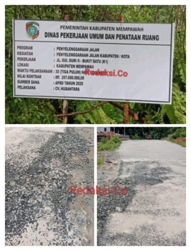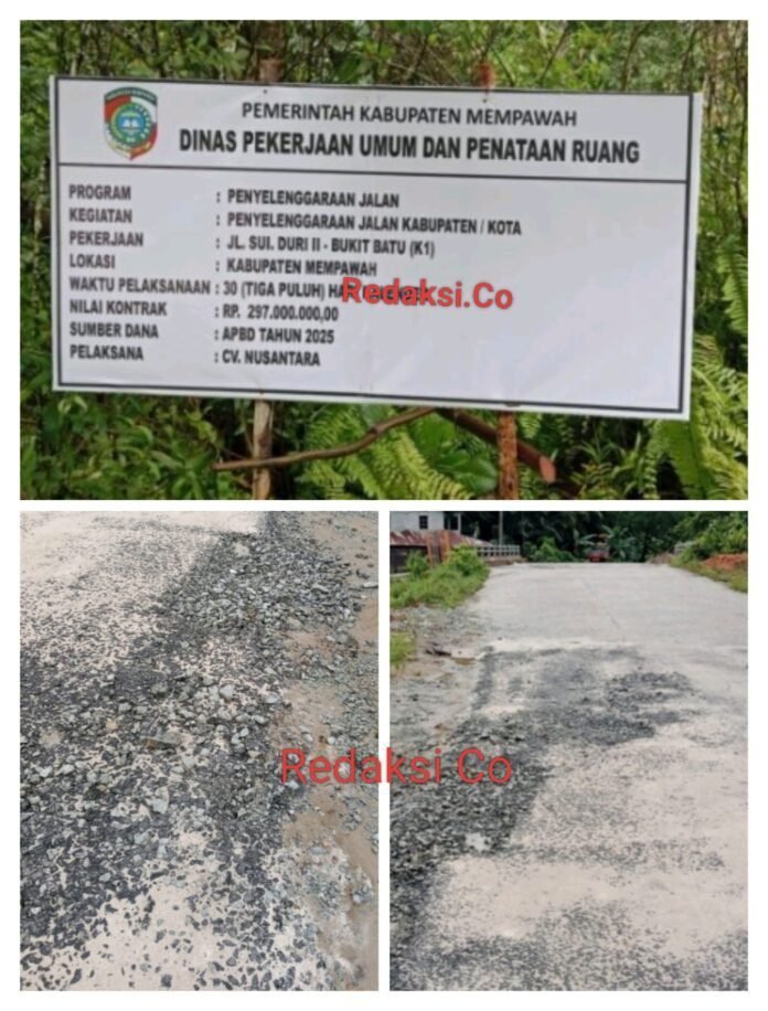 Paket basah kuyup pemeliharaan Jalan Sei Duri Dua – Bukit Batu segede Rp. 297 Juta dari celengan APBD Mempawah Tahun Anggaran 2025, dinilai jauh dari cerminan kualitas dan kwantitas.