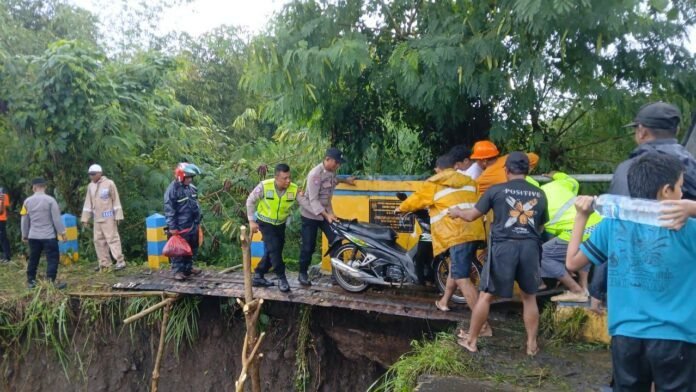 Kejadian ini mengakibatkan kendaraan tidak dapat melintas, sementara arus banjir masih deras dan hujan terus turun.