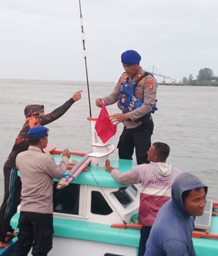 Dalam rangka menyambut Hari Ulang Tahun Kemerdekaan Republik Indonesia ke-80, Satuan Polisi Perairan dan Udara (Satpolairud) Polres Aceh Barat melaksanakan kegiatan patroli dan pembagian Bendera Merah Putih kepada para nelayan di perairan Kabupaten Aceh Barat, pada Senin pagi,04/08/2025 .