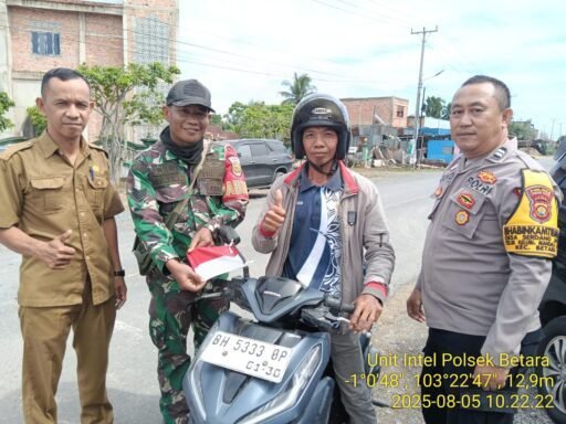 Pembagian Bendera Merah Putih yang dilaksanakan personel Kepolisian Polsek jajaran Polres Tanjung Jabung Barat Polda Jambi di wilayah hukum Polsek masing-masing, Selasa (5/8/2025).