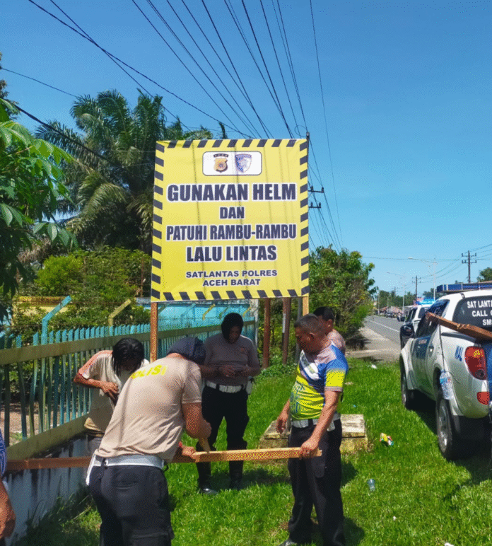 Guna meningkatkan kesadaran masyarakat terhadap keselamatan berkendara, Satuan Lalu Lintas (Satlantas) Polres Aceh Barat melakukan pemasangan spanduk himbauan di sejumlah titik rawan kecelakaan lalu lintas (lakalantas), Selasa 27/5/2025.