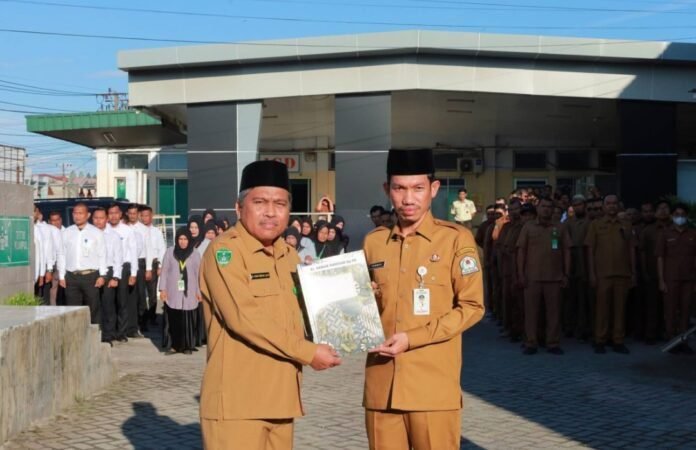 Bupati Aceh Barat, Tarmizi SP,MM memimpin kegiatan apel pagi di halaman Rumah Sakit Umum Daerah (RSUD) Cut Nyak Dhien Meulaboh pada Senin ,12/1/2026