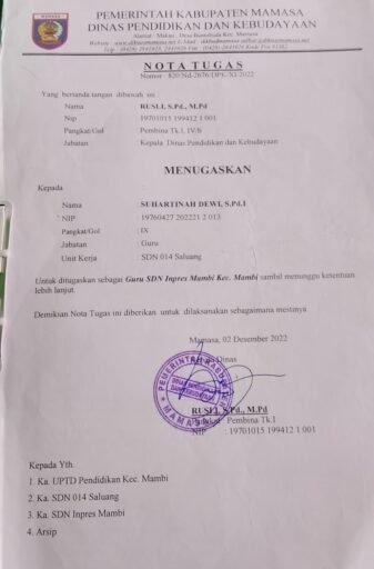 Setelah itu? Bak ditelan bumi. Oknum tersebut tiba-tiba muncul hanya untuk menyodorkan selembar “surat sakti” berupa Nota Tugas ke SDN Inpres Mambi yang ditandatangani oleh Kadis Pendidikan (saat itu), Rusli, S.Pd., M.Pd., tertanggal 02 Desember 2022.