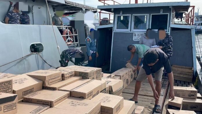 Adapun data kapal yang diamankan yaitu KM Dolphin, GT 22, jenis kapal Cargo (kayu), berbendera Indonesia, dinakhodai oleh A, pemilik kapal SH, membawa 4 orang ABK, serta dengan muatan produk campuran Nestle sejumlah 1.956 kardus.