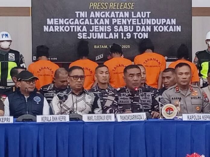 Turut hadir dalam konferensi pers tersebut, Pangkoarmada I, Wagub Kepri, Kapolda Kepri, Kajati Kepri, Kepala BNN Kepri, Bea Cukai Kepri, Danlantamal IV, Lanal TBK, dan awak media. (Redaksi)