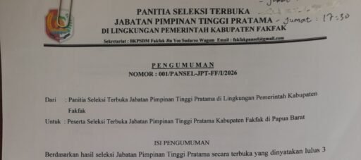 FAKFAK, Redaksi.co — Panitia Seleksi Terbuka Jabatan Pimpinan Tinggi (JPT) Pratama di Lingkungan Pemerintah Kabupaten Fakfak secara resmi mengumumkan hasil seleksi terbuka tahun 2026. Pengumuman tersebut tertuang dalam Pengumuman Nomor 001/PANSEL-JPT-FF/I/2026 yang ditetapkan pada 7 Januari 2026.