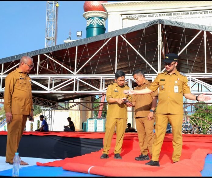 Wakil Bupati Aceh Barat, Said Fadheil, didampingi Plt. Sekda Dr. Kurdi meninjau langsung kesiapan venue pelaksanaan Tabligh Akbar dan Halal Bihalal Pemerintah Kabupaten Aceh Barat yang akan digelar di halaman Masjid Agung Baitul Makmur, Selasa, 31/3/2026