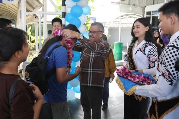 Sekretaris Daerah Kota Batam H Jefridin, mengalungkan bunga kepada wisatawan dan