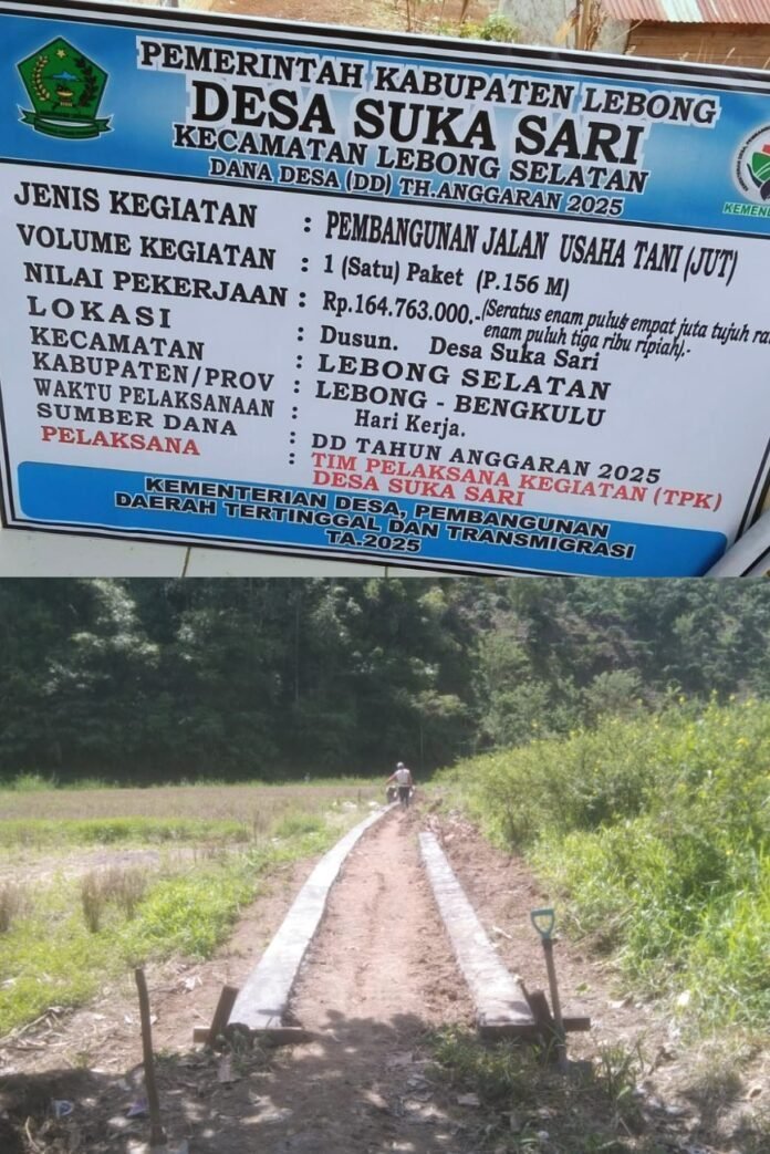 LEBONG – REDAKSI.CO Proyek pembangunan Jalan Usaha Tani (JUT) sepanjang 156 meter di Desa Sukasari, Kecamatan Lebong Selatan, Kabupaten Lebong, yang menelan anggaran Dana Desa (DD) Tahun Anggaran 2025 sebesar Rp 164.763.000,00, kini menjadi sorotan tajam. Pasalnya, dugaan mark up anggaran dan ketidak sesuaian spesifikasi pembangunan mengemuka, menimbulkan kekhawatiran akan kualitas dan ketahanan infrastruktur vital bagi petani setempat. Sebuah sumber warga yang enggan disebut namanya membongkar praktik mencurigakan di balik megahnya papan proyek.